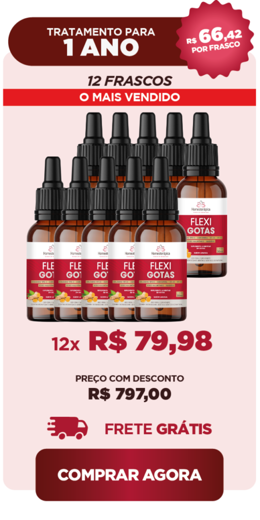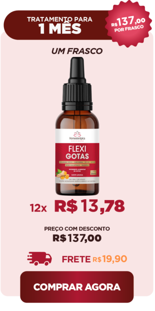 Elaborado sob os preceitos da Homeoterápica Farmácia de Manipulação, FlexiGotas tem ação sinérgica, a qual implica em cada um dos seus componentes potencializar a ação dos outros, agindo diretamente na causa das dores articulares, estimulando a regeneração do tecido cartilaginoso, lubrificando e protegendo as articulações, reduzindo a inflamação e a dor.